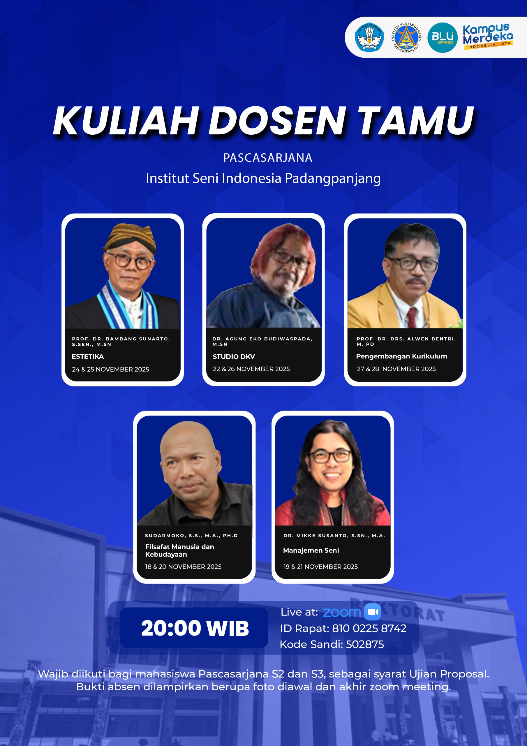 Padangpanjang — 19 November 2025. Program Pascasarjana Institut Seni Indonesia (ISI) Padangpanjang kembali menyelenggarakan Kuliah Dosen Tamu sebagai bagian dari penguatan kompetensi akademik mahasiswa Magister (S2) dan Doktor (S3). Kegiatan yang berlangsung secara daring tersebut menghadirkan lima narasumber terkemuka di bidang seni, budaya, estetika, hingga pengembangan kurikulum.