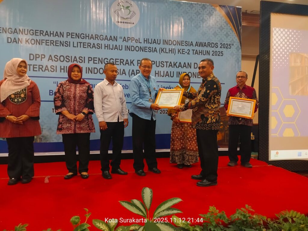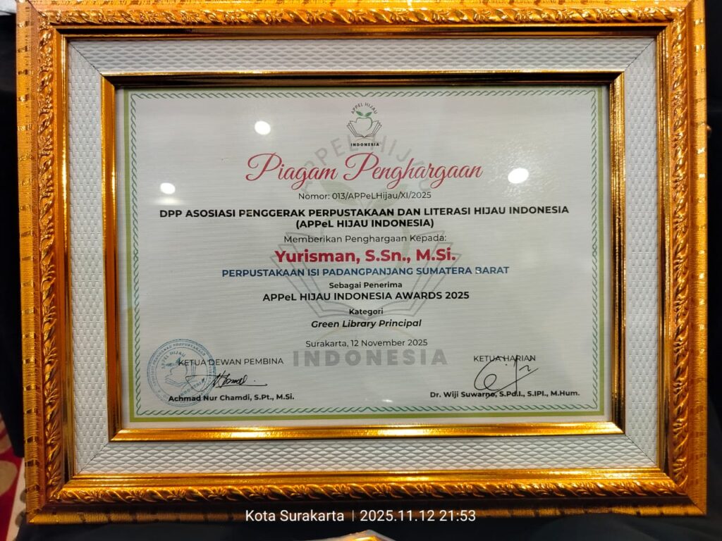 Surakarta, 12 November 2025 — Institut Seni Indonesia (ISI) Padangpanjang menorehkan prestasi membanggakan di tingkat nasional. Dalam ajang APPel Hijau Indonesia Awards 2025 yang diselenggarakan oleh Dewan Pimpinan Pusat (DPP) Asosiasi Penggerak Perpustakaan dan Literasi Hijau Indonesia (APPel Hijau Indonesia), ISI Padangpanjang berhasil meraih dua penghargaan bergengsi, yaitu kategori Green Art University dan kategori Green Library Principal yang diberikan kepada Kepala UPA Perpustakaan dan Perpustakaan ISI Padangpanjang